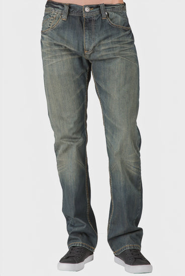 Old school inspired trendy attire, nothing but straight cut simplicity. The artful hand rub whiskering of this faded vintage blue denim jean is so natural, comfort comes just by looking at them. Their tinted rustic wash keeps them cool with retro authenticity. While the scratching can only be described as a work of pure craftsmanship.