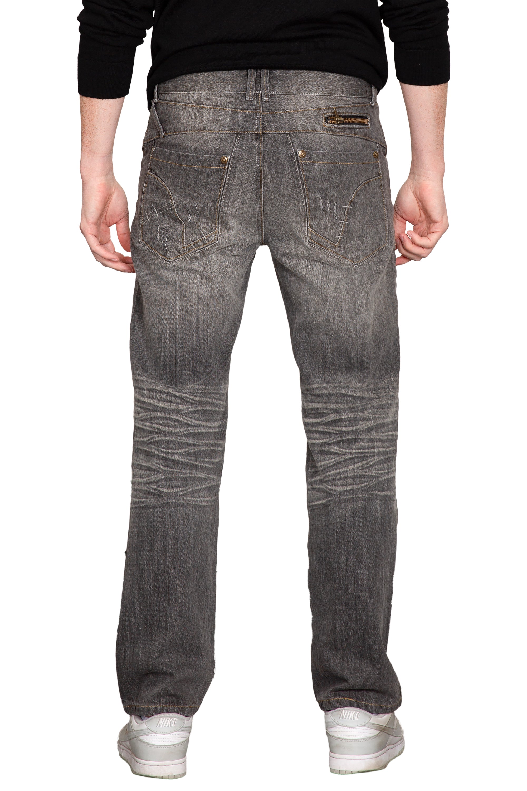 These faded blue jeans are proof there is more to the street than what you see at eye level. Relaxed fit premium denim that's perfect for a double-take. When you realize the hand-crafted, sanded, and artisan detail, you will realize elevated fashion. Rugged with an urban feel, these midrise jeans are whiskered and scratched and finished with a stylish zipper trim back pocket.