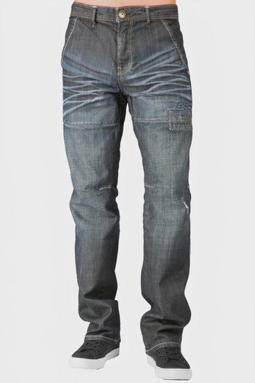 • With authentic hand rub whiskering and scratching, these premium dark denim jeans are both classic and innovative. These men's straight cut and stoned washed jeans are designed to fit in, while it's artisan front patch pocket is just enough to make you stand out.